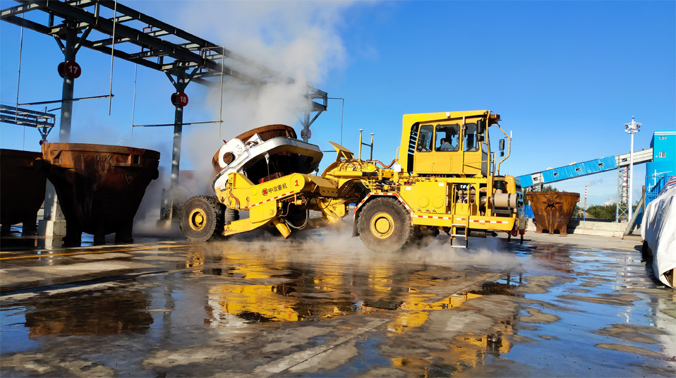 由中冶寶鋼研制的70噸鉸接式抱罐車,采用鵝頸鉸接型式,額定載重75噸,重載最高時速為每小時20公里,翻罐角度105度,最大爬坡能力8%,最小轉(zhuǎn)彎半徑9米。該車型應(yīng)用專利技術(shù)10項,在國內(nèi)有色冶煉市場占有率超過75%,先后榮獲中國有色工業(yè)協(xié)會、中國鋼鐵工業(yè)協(xié)會科技獎,中國施工企業(yè)管理和中國循環(huán)經(jīng)濟協(xié)會專利獎等榮譽。